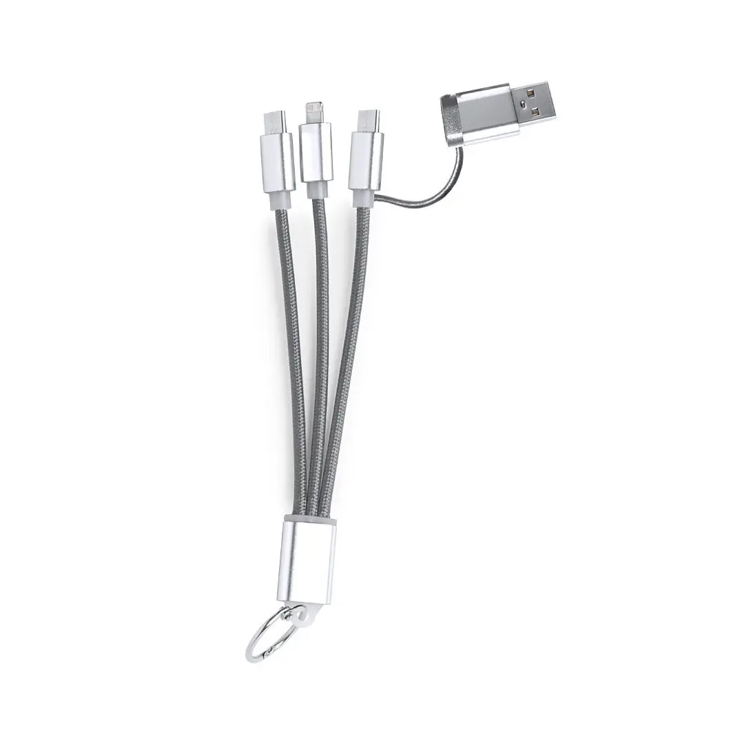 Cable carregador amb connexió dual micro USB/Lightning i tipus C (entrada i sortida). Connectors d'alumini i xapa especialment dissenyat per a marcatge en làser.