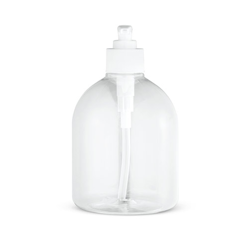 Flascó amb dosificador fabricat en PE i PP, amb capacitat per a 500 ml. Recarregable i reutilitzable.ø85 x 150 mm