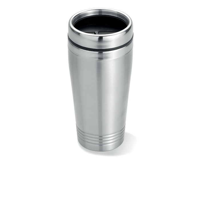 Tassa de viatge d'acer inoxidable de doble paret amb tapa PP negra. Capacitat: 400 ml.